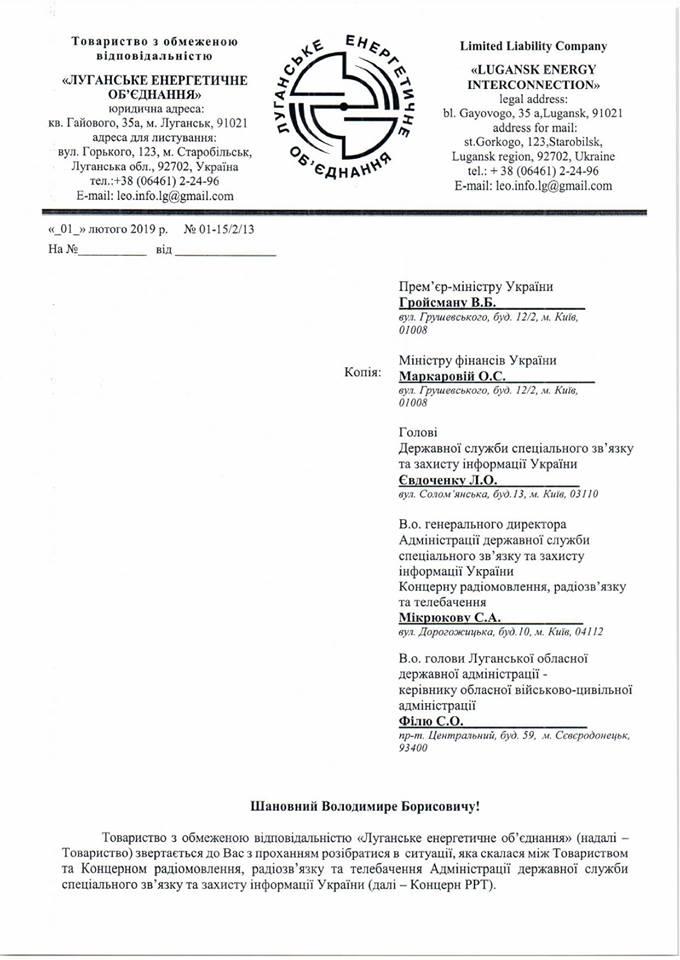 ООО "Луганское энергетическое объединение" обратилось к премьер-министру Украины Гройсману и другим представителям власти с просьбой разобраться в ситуации, которая сложилась между ООО "ЛЭО" и Концерном Радиовещания, радиосвязи и телевидения.