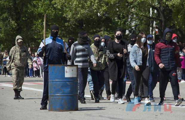 Также сотрудники "МВД ЛНР" воссоздали противостояние протестующих с "Беркутом" на Майдане в Киеве в 2014 году.