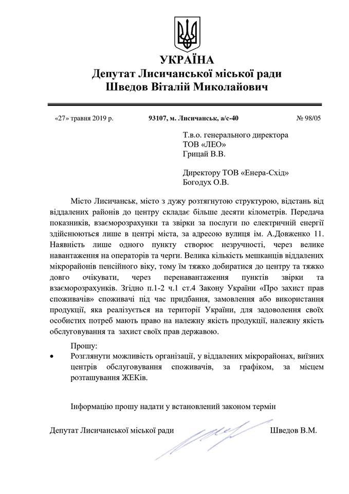 Инициативу организации абонентских столов "ЛЭО" и "Енера-Схід" в ЖЭКах города Лисичанска Луганской области проявил городской депутат Виталий Шведов.