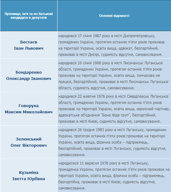 На данный момент по лисичанскому округу зарегистрировано 14 кандидатов, все - самовыдвиженцы. Среди них мэр Лисичанска Сергей Шилин и депутат Лисичанского горсовета Виталий Шведов. Интересно, что в списке кандидатов оказался однофамилец президента Украины Олег Зеленский и двое кандидатов с фамилией Рыбалка.