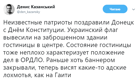 Так, журналист Денис Казанский поделился скрином, на котором видно, что на заброшенном здании донецкой гостиницы вывешен украинский флаг.