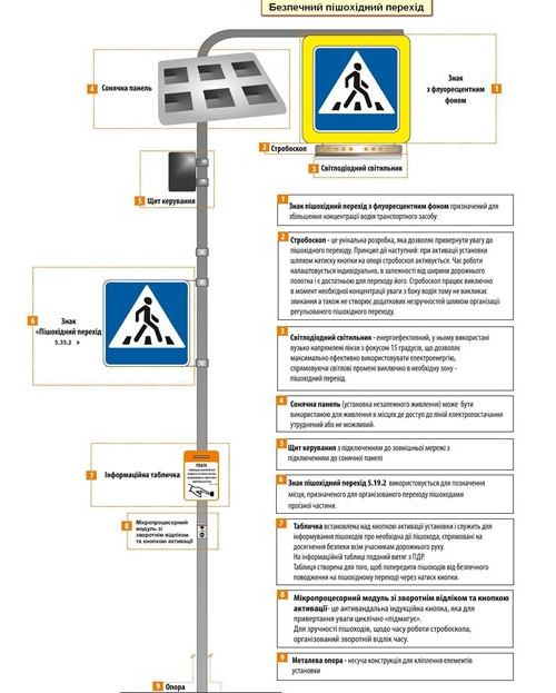 В рамках этого проекта в г. Лисичанске необходимо установить 8 опор освещения с установкой знаков пешеходный переход 5.35.1 и 5.35.2, с автономными светильниками для дополнительного освещения самого знака и пешеходного перехода, стробоскопом (уникальная разработка, которая позволяет привлечь внимание участников дорожного движения к пешеходному переходу), кнопкой активации стробоскопа, световым и звуковым оповещателем (для жителей с ограниченными возможностями слуха и зрения и других категорий граждан).