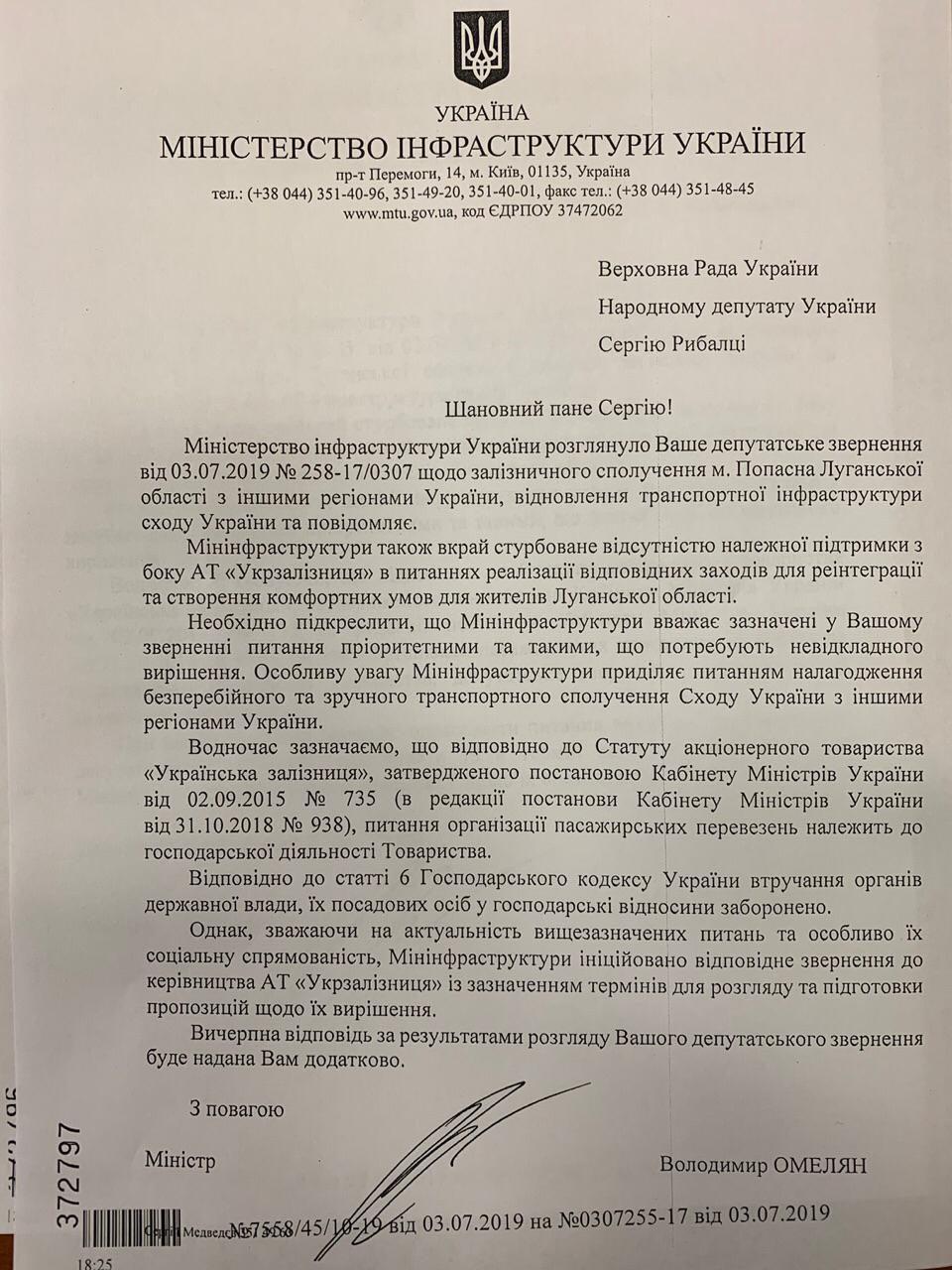 «Я возмущен бездействием должностных лиц АО «Укрзалізниця», которые должны знать и решать такие проблемы. Мною даны соответствующие поручения структурным подразделениям Министерства инфраструктуры и АО «Укрзалізниця» и поставлены конкретные сроки для подготовки предложений для решения указанных проблем. Об осуществлении мер Вам будет предоставлен полный и исчерпывающий ответ», - говорится в тексте ответа Владимира Омеляна на запрос народного депутата Сергея Рыбалки.