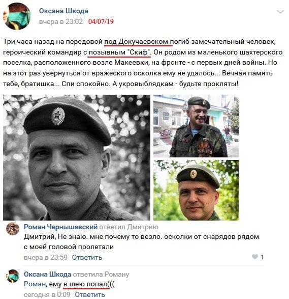 Как сообщил в Твиттере блогер Necro Mancer, Новиков Евгений Валерьевич с позывным "Скиф" погиб 4 июля в районе Докучаевска. По данным, опубликованным в сепаратистских сообществах, ему попал в шею осколок снаряда.