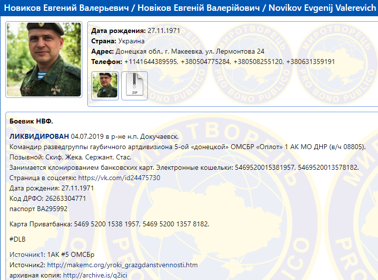 На сайте "Миротворец" указано, что Новиков был командиром разведгруппы гаубичного артдивизиона 5-ой «донецкой» ОМСБР «Оплот» 1 АК МО ДНР (в/ч 08805). Также террорист занимался клонированием банковских карт.