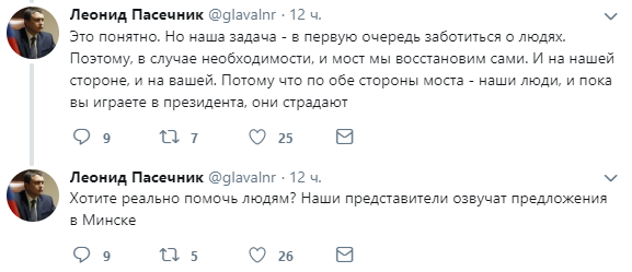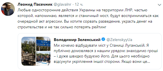 Он заявил, что мост в Станице якобы является частью "ЛНР", и любые односторонние действия Украины там "будут восприниматься как очередной акт агрессии".