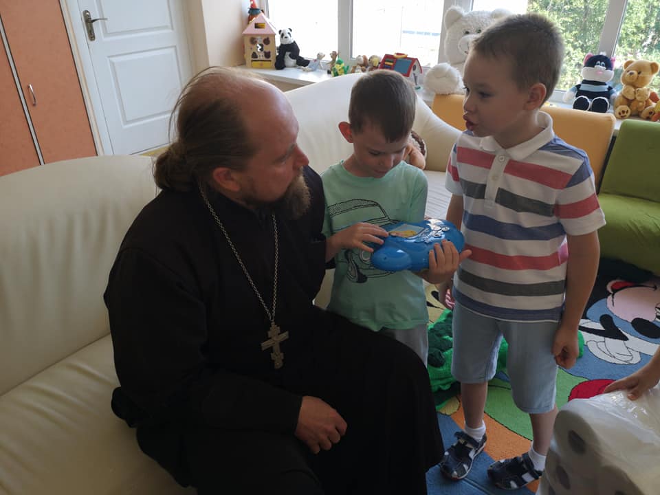 Настоятель храма Иконы Божьей Матери Печерской иерей Юрий Помазан вместе с волонтером Евгением Гуевара, от волонтерского центра «Надежда», посетили областной дом ребенка в Северодонецке Луганской области.