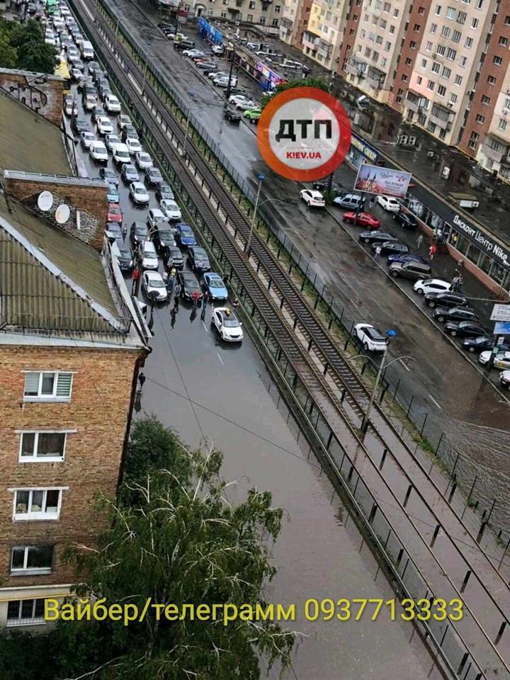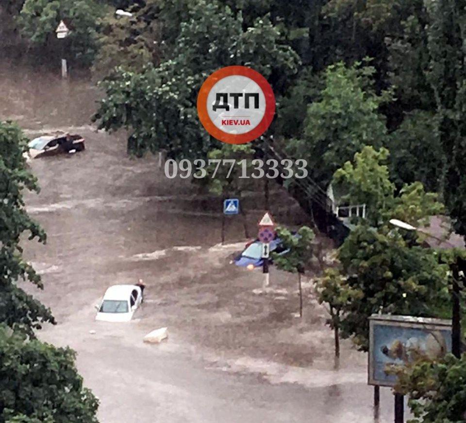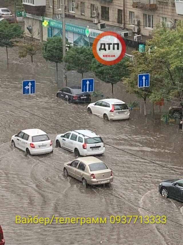 Потоп наблюдается на улице Антоновича пред Оушен-плазой, подтопило также Скоростной и Индустриальный.