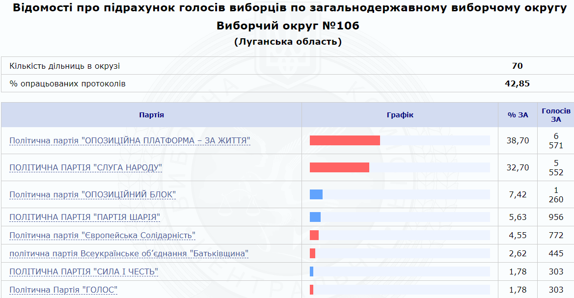Среди партий 38,7% северодончан отдали голос "Оппозиционной платформе", 32,7% проголосовали за "Слугу народа".