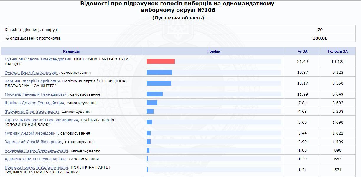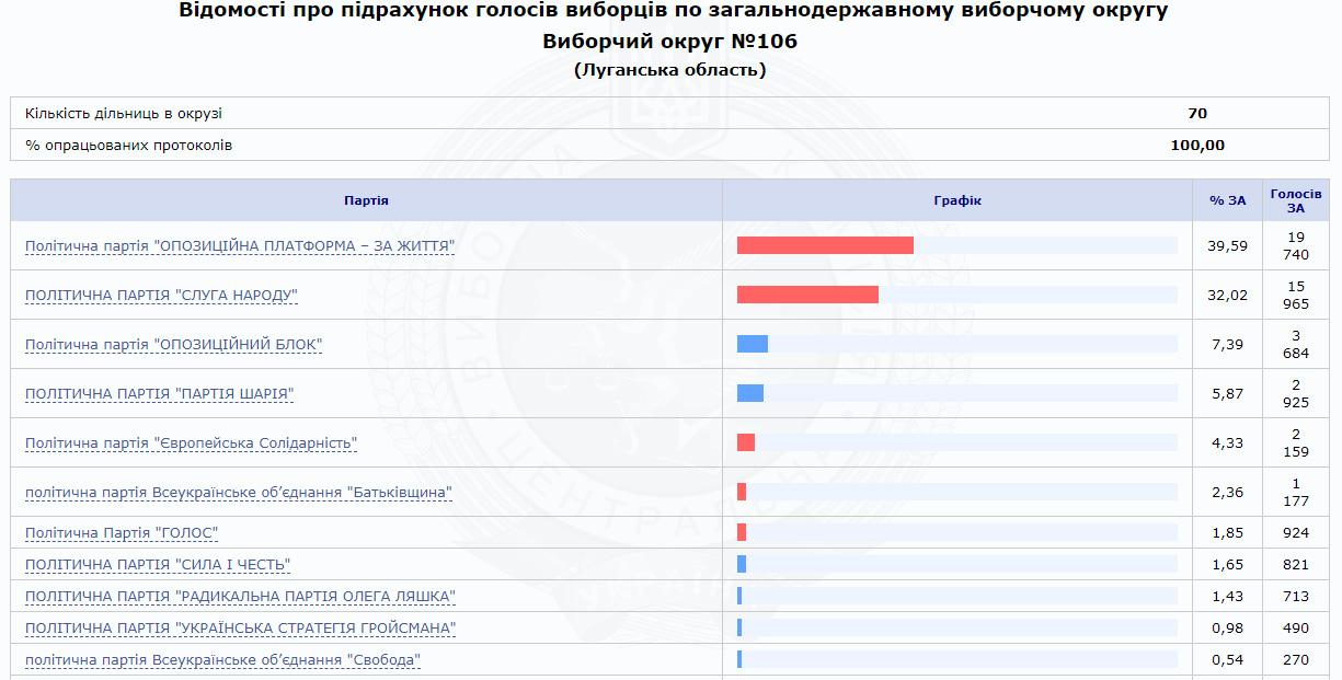 В голосовании по партиям победителем вышло партийное объединение "Оппозиционная платформа - За жизнь", набравшая 39,59% (или 19 740 голосов жителей Луганщины).