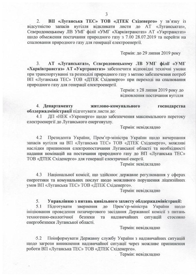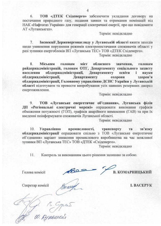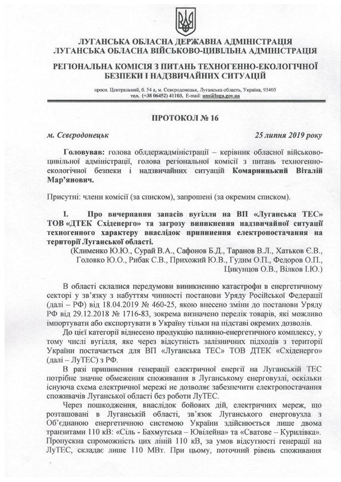Как отмечается в протоколе, в области возникла угроза катастрофы в энергетическом секторе. Причина - постановление правительства РФ, согласно которому топливо, в том числе уголь, может экспортироваться в Украину только на основании отдельных разрешений. Как известно, уголь на Луганскую ТЭС поставляется из РФ, поскольку со стороны Украины отсутствуют железнодорожные подходы.