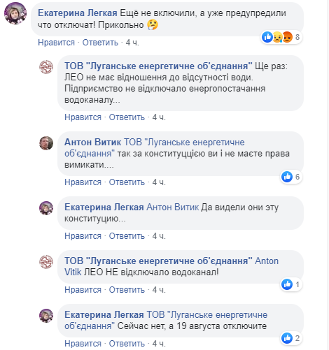 "Рубежанский, Кременской, Лисичанский водоканалы и ООО "ТАУН СЕРВИС" (Северодонецкий водоканал) получили предупреждения от ООО "ЛЭО" об отключении 19 августа 2019 года. Все остальные обесточивания не связаны с деятельностью энергетической компании", - заявили в ЛЭО.