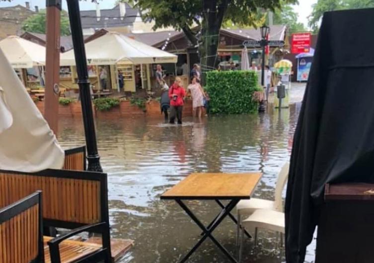 Уровень воды на Дерибасовской улице достиг полуметра. На трассе Одесса-Киев автомобили также съезжают на обочину.