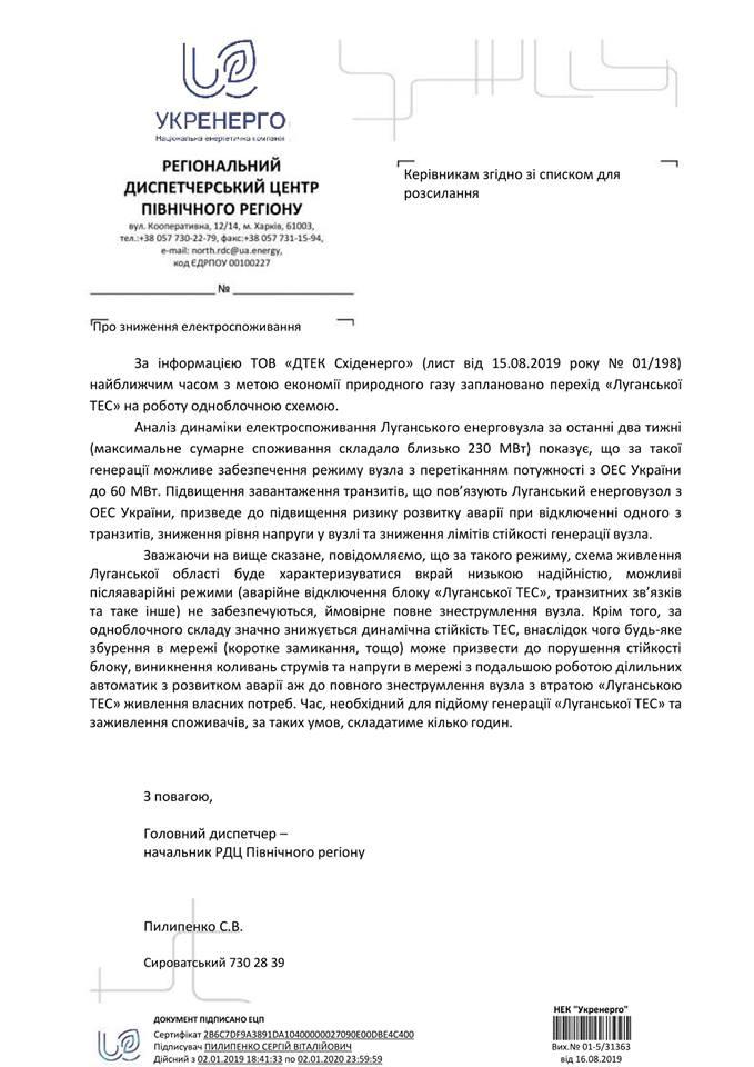 "В связи с тем, что Луганской ТЭС в ближайшее время с целью экономии природного газа запланирован переход на работу одноблочной схемой (по информации ООО "ДТЭК Востокэнерго"), Региональный Диспетчерский Пункт Северного Региона "Укрэнерго" предупредило ООО "ЛЭО" письмом о том, что питание Луганской области будет характеризоваться крайне низкой надежностью. Вероятны нарушения в работе и полное обесточивание узла. "Время на восстановление генерации Луганской ТЭС и запитки потребителей в случае отключений будет составлять несколько часов", - говорится в обращении.