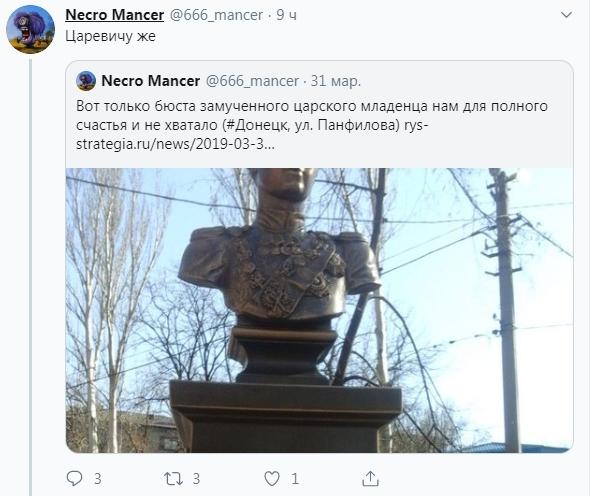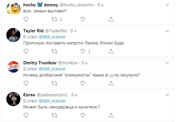 В сети уже развернулось бурное обсуждение данного события. Пользователи Твиттера негодуют, что, мол, скоро всю расстрелянную семью самодержца увековечат. Ведь в марте этого года в том же Донецке уже установили скульптуру-бюст "цесаревичу-мученику Алексею Николаевичу".