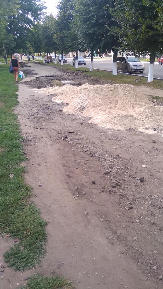 В Лисичанске на проспекте Победы напротив "Ощадбанка" невозможно пройти по тротуару: он весь перерыт, насыпаны кучи песка.