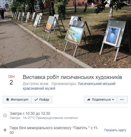"Наш город богат не только на трудолюбивых людей рабочих профессий, он также подарил миру талантливых поэтов и художников. Именно поэтому в День города мы предлагаем всем ознакомиться с работами современных лисичанских художников", - говорится в объявлении в Фейсбуке.