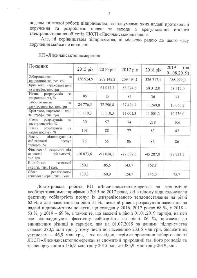 Относительно "Лисичансктеплосети" в ЛОГА заявили, что предприятие работало по экономически необоснованным тарифам, уровень оплаты услуг теплоснабжения населением низкий, а нынешние тарифы возмещают фактическую себестоимость услуги на 86%. Это привело к возникновению разницы в тарифах и стремительному росту задолженности "Лисичансктеплосети" за газ.