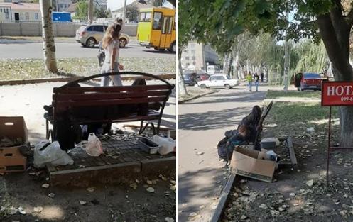 Неравнодушные жители Лисичанска в Facebook опубликовали фото, где видно, как на лавочке спит "бомж", а вокруг его импровизированной кровати разбросана гора мусора.