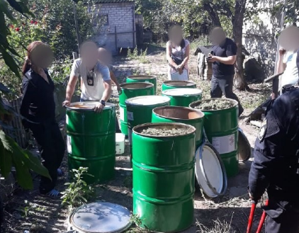 В ходе проведения санкционированного обыска было обнаружено и изъято 9 металлических бочек по 200 л, заполненных высушенной марихуаной, два полиэтиленовых пакета с высушенными но еще не измельченными соцветиями конопли, 710 кустов растений конопли.