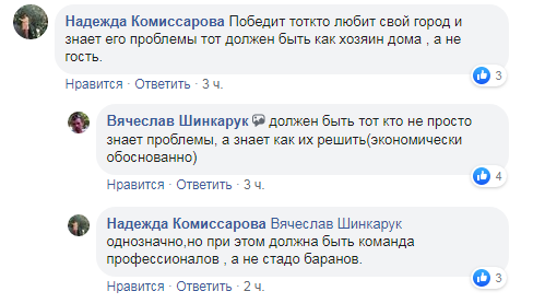 Примерно за пять часов набралось около сотни комментариев. Однако лисичане не спешат делиться конкретными фамилиями потенциальных избранников на пост мэра. Большая часть комментариев – выдвижение критериев, которыми должен обладать глава города, и пожелания к тому, что он должен будет сделать.