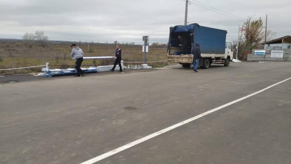 Сотрудники ООО «Флангер» занимаются установлением колонок на автодороге от КПВВ до моста для разделения потока пешеходов от части дороги, по которой курсирует автобус.