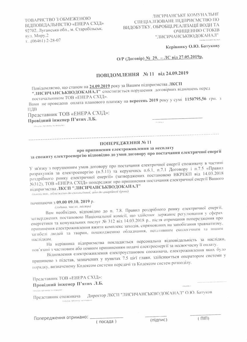 Еще одно предупреждение водоканал получил от ООО "Луганское энергетическое объединение". Согласно этому документу, "Лисичанскводоканал" должны обесточить в 9:00 часов 18 октября. Причина отключения - долг водоканала за электроэнергию в размере более 167 млн. грн.
