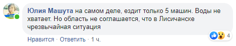 Депутат Лисичанского горсовета Юлия Машута сообщила, что воду подвозят всего 5 машин, воды на всех не хватает.
