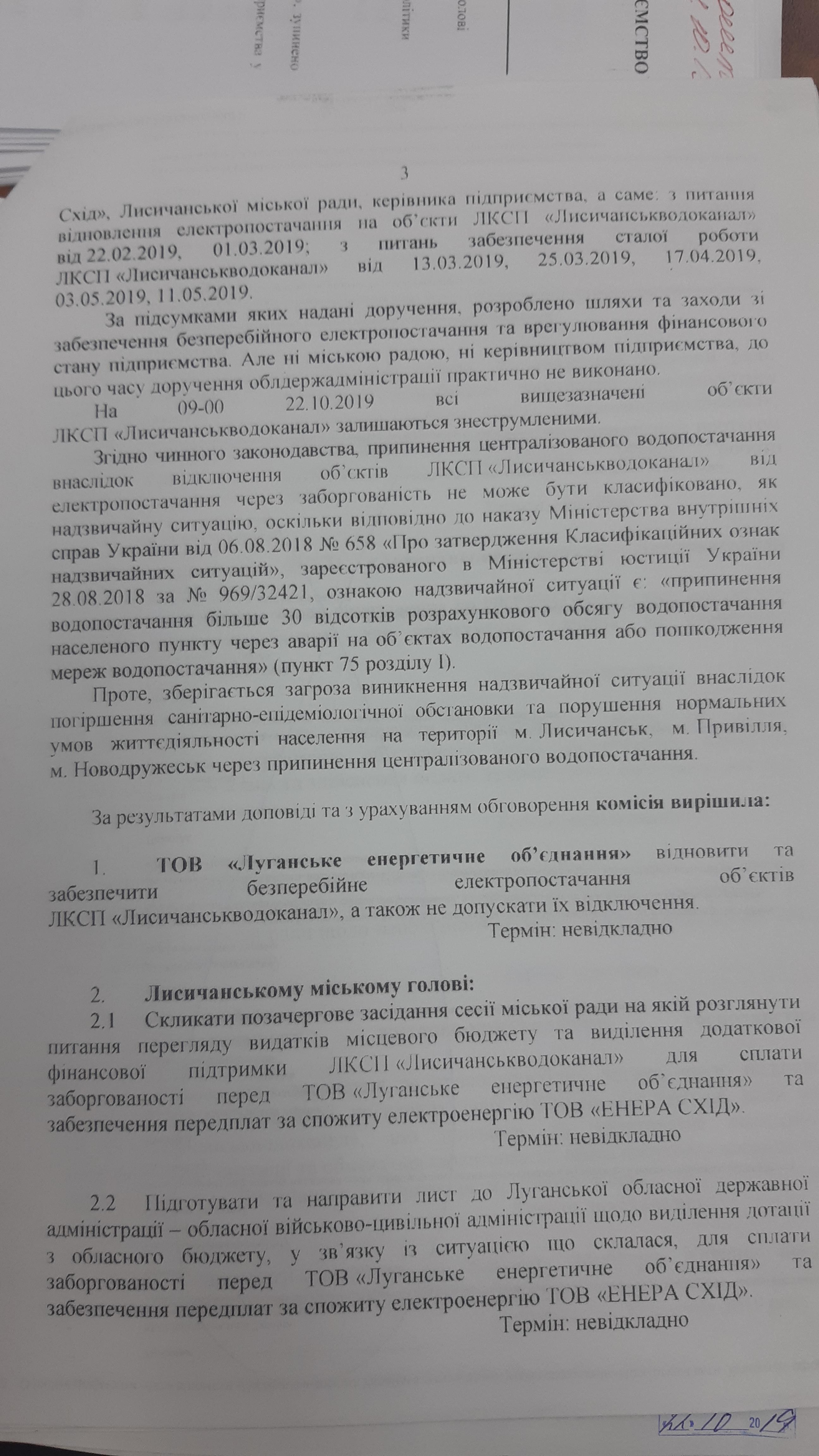 Как указывается в протоколе заседания областной комиссии ТЭБ и ЧС, прекращение централизованного водоснабжения вследствие отключения объектов ЛКСП "Лисичанскводоканал" от электроснабжения из-за задолженности не может быть квалифицировано, как чрезвычайная ситуация, поскольку в соответствии с приказом МВД, признаком ЧС является прекращение водоснабжения более 30% расчетного объема водоснабжения населенного пункта из-за аварии на объектах водоснабжения или повреждения сетей водоснабжения.