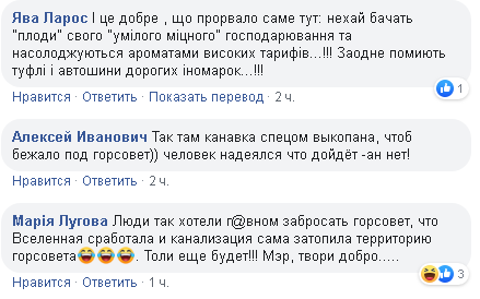 "16:40, пятница, 25 октября. Городской совет Лисичанска. Канализация рекой течет... ребят, а может все таки выделить 55 миллионов гривен экологических средств на ремонт труб? Или все же парк важнее для ВСЕХ жителей города?", - написал пользователь сети Олег Мельничук.
