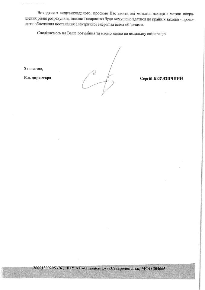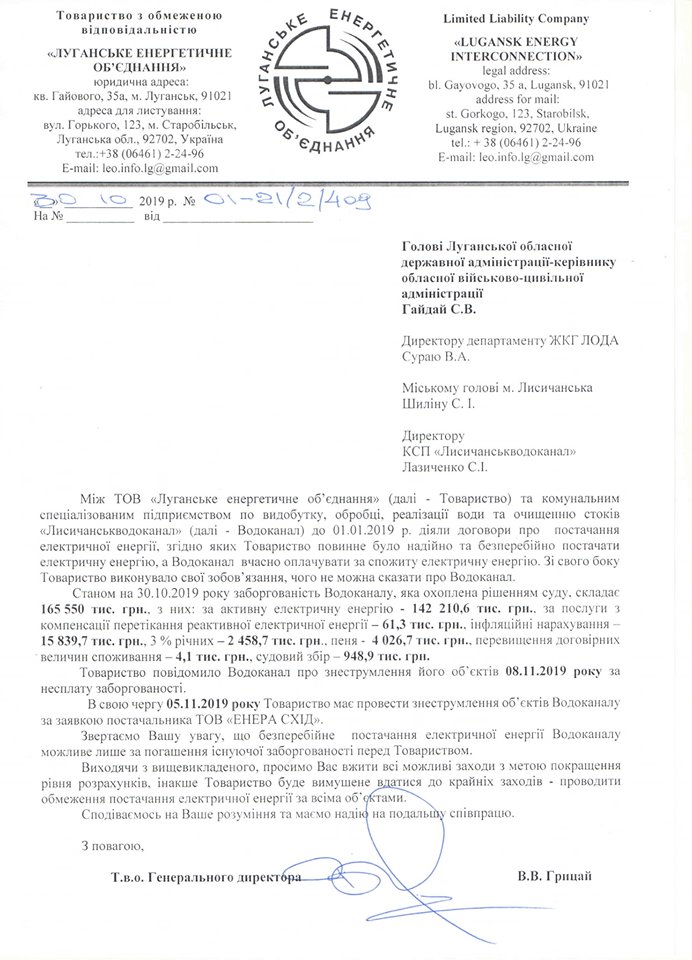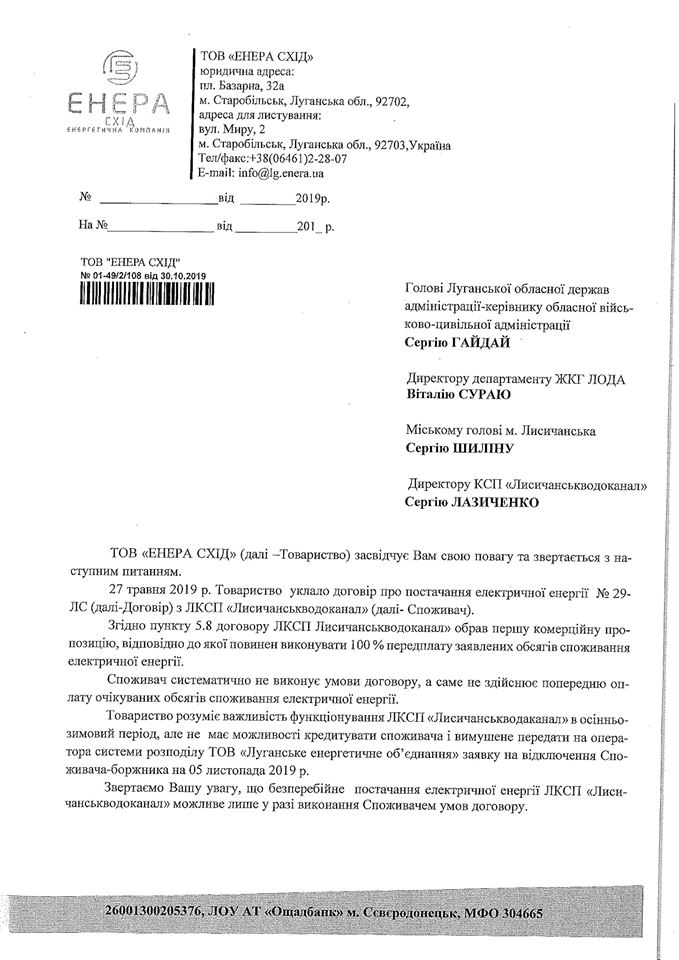 "Енера Схід", в свою очередь, также направила Гайдаю письмо с той же просьбой, в котором указывает, что "Лисичанскводоканал" систематически не выполняет условия договора от 27.05.2019 г., а именно обязательства о 100-процентной предоплате за электроэнергию.