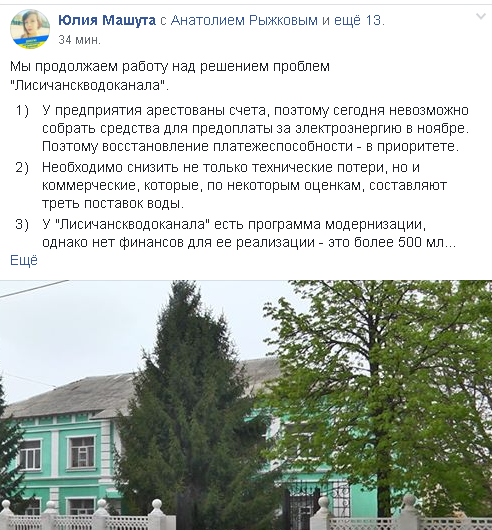 "Мы продолжаем работу над решением проблем "Лисичанскводоканала", - написала Машута в Facebook, передает Час Пик.