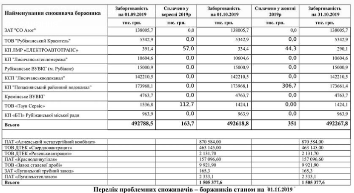 ООО "Луганское энергетическое объединение" опубликовал список должников на 1 ноября. За использованную электроэненергию оплатил только КП ЛГС "Электроавтотранс" - 0,7 тыс. грн.