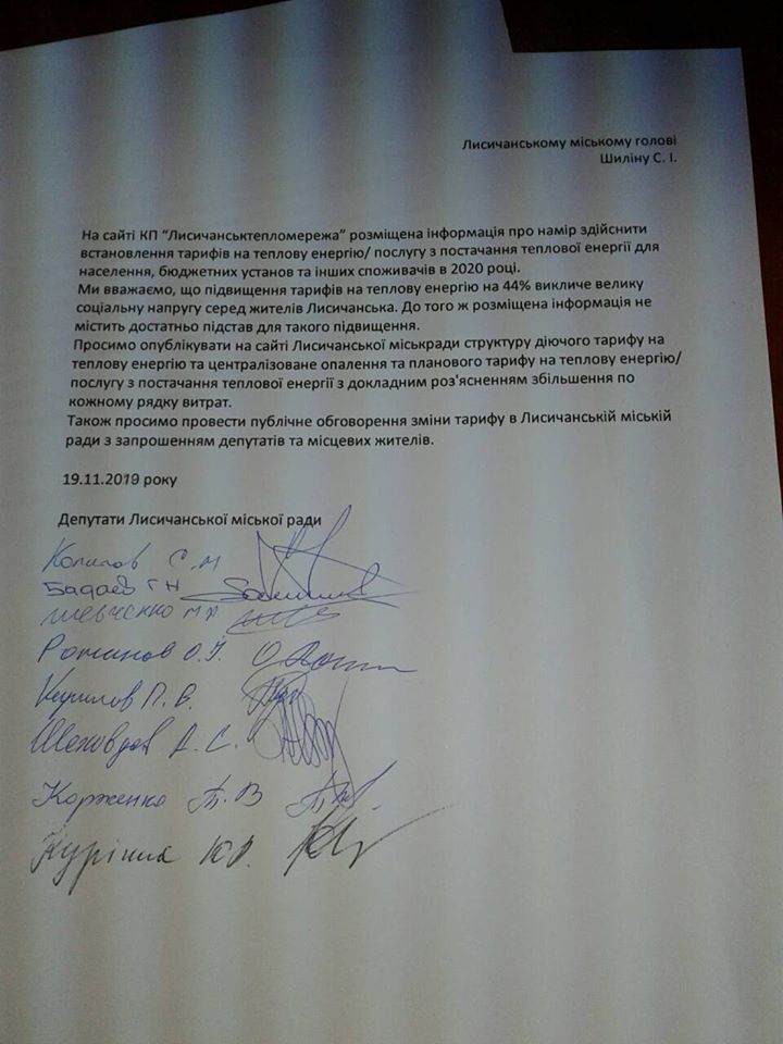Сегодня несколько депутатов Лисичанского горсовета обратились к городскому голове Лисичанска с просьбой провести публичные слушания по тарифам на услуги "Лисичансктеплосети".