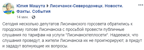 "Надеемся, что слушания проведут, а жители Лисичанска их не проигнорируют, а придут и зададут волнующие их вопросы", - пишет депутат.