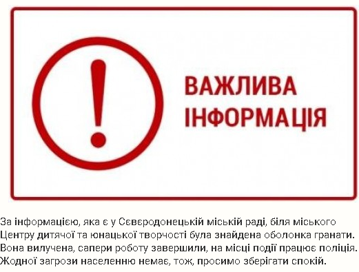 "По информации, которая есть в Северодонецком городском совете, у городского Центра детского и юношеского творчества была найдена оболочка гранаты. Она изъята, саперы работу завершили, на месте происшествия работает полиция", - говорится в сообщении.