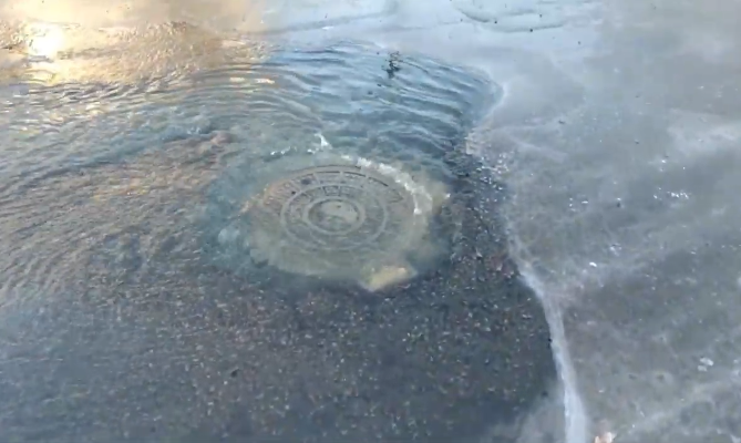 Как видно на кадрах, фекальная река буквально фонтаном вырывается из-под люка, мощным потоком течет по дороге и замерзает на морозе. Толстым слоем вонючего льда покрыта проезжая часть и тротуар.