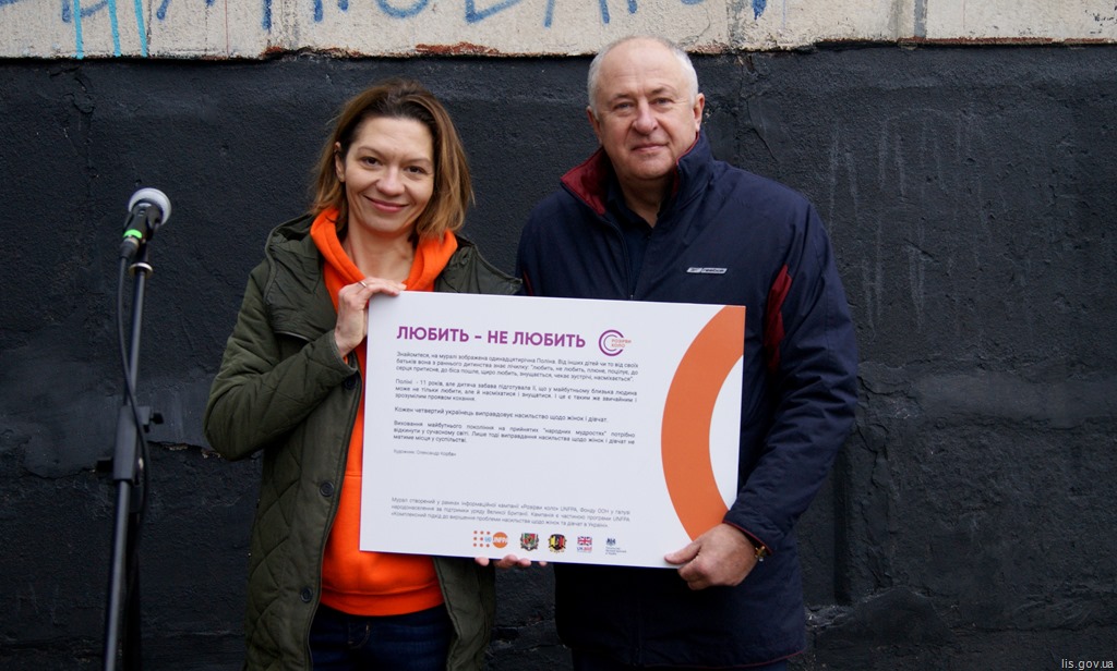 Координатор по вопросам гуманитарного реагирования в Луганской области Фонда ООН в области народонаселения Анна Высоцкая поблагодарила городскую власть Лисичанска за сотрудничество в создании мурала и торжественно передала табличку с информацией о рисунке, которая будет размещена на доме работниками ЖЕКа № 5.