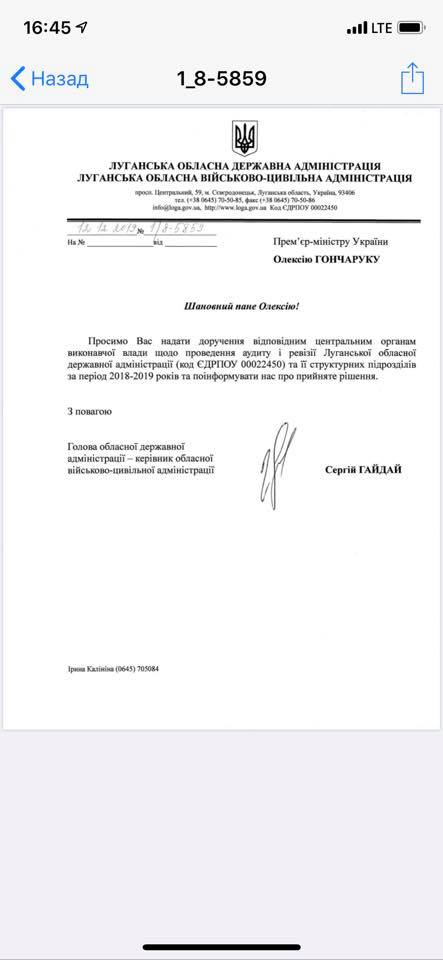 "Прошу премьер-министра Украины Алексея Гончарука поручить провести ревизию структурных подразделений Луганской ОГА за период 2018-2019 годов! Быть добру!", - сказано в сообщении.