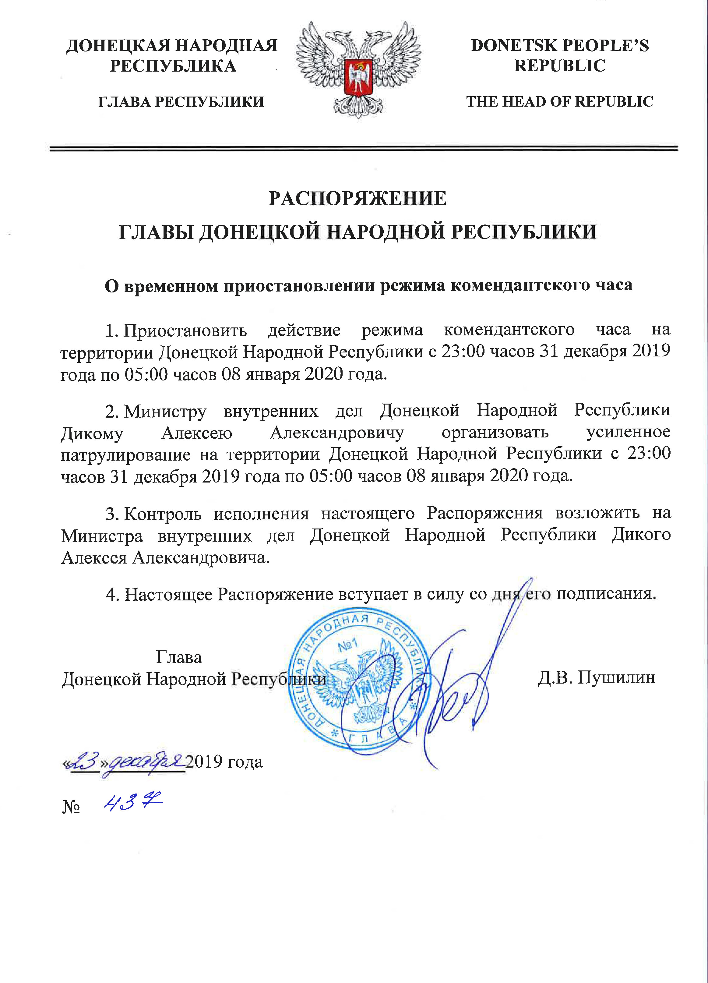 По распоряжению главаря террористической организации "ДНР" Дениса Пушилина комендантский час приостановлен на новогодние праздники, а точнее с 23:00 31 декабря 2019 года до 5:00 8 января 2020 года, передает Час Пик со ссылкой на сепаратистские СМИ. В этом же распоряжении указано, что по территории так называемой ДНР на время отсутствия комендантского часа будет усилено патрулирование.