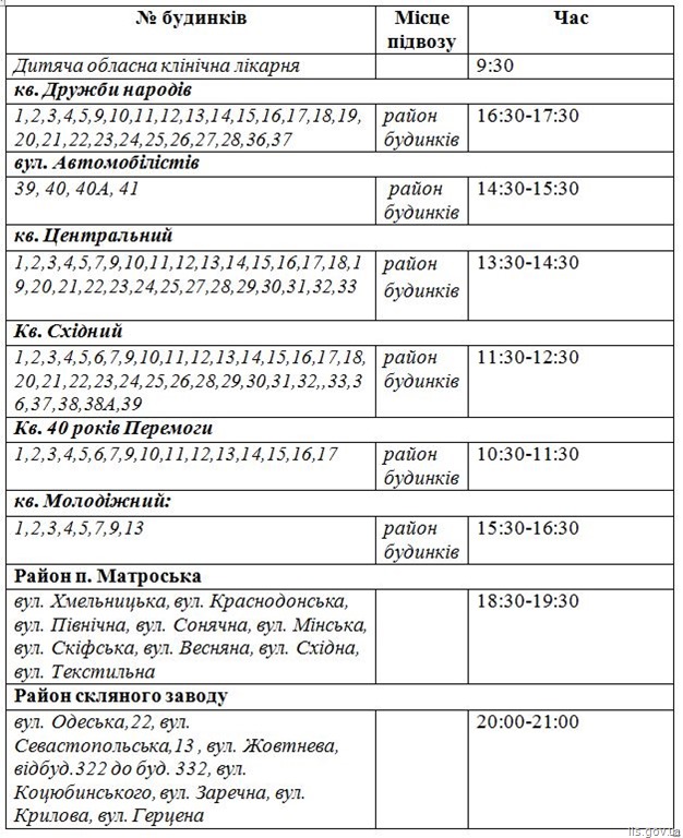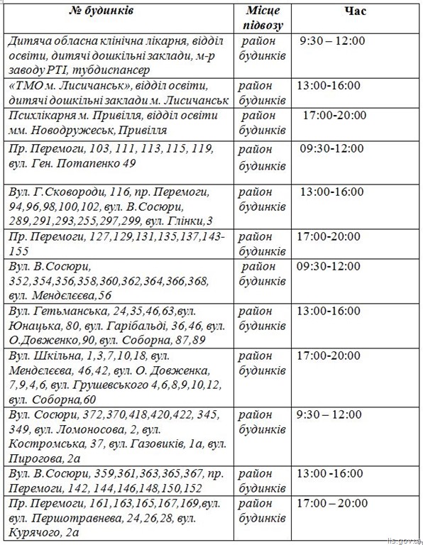 Для оперативного решения вопроса обеспечения питьевой водой объектов социальной сферы и населения ЛКСП «Лисичанскводоканал» совместно с Главным управлением ГСЧС в Луганской области разработан график подвоза питьевой и технической воды.
