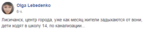"Лисичанск, центр города, уже как месяц жители задыхаются от вони, дети ходят в школу 14, по канализации..." - пишет автор поста.