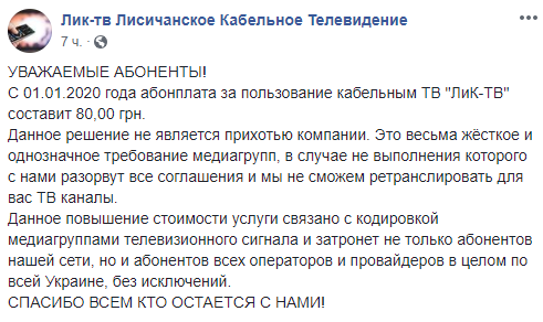 "С 01.01.2020 года абонплата за пользование кабельным ТВ "ЛиК-ТВ" составит 80,00 грн.", - говорится в сообщении