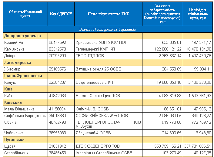 Теплоснабжающая компания «ДТЭК Востокэнерго» в г. Счастье задолжала более 550 миллионов гривен. В качестве минимальной суммы для первого взноса нужно внести 337 781 гривен.