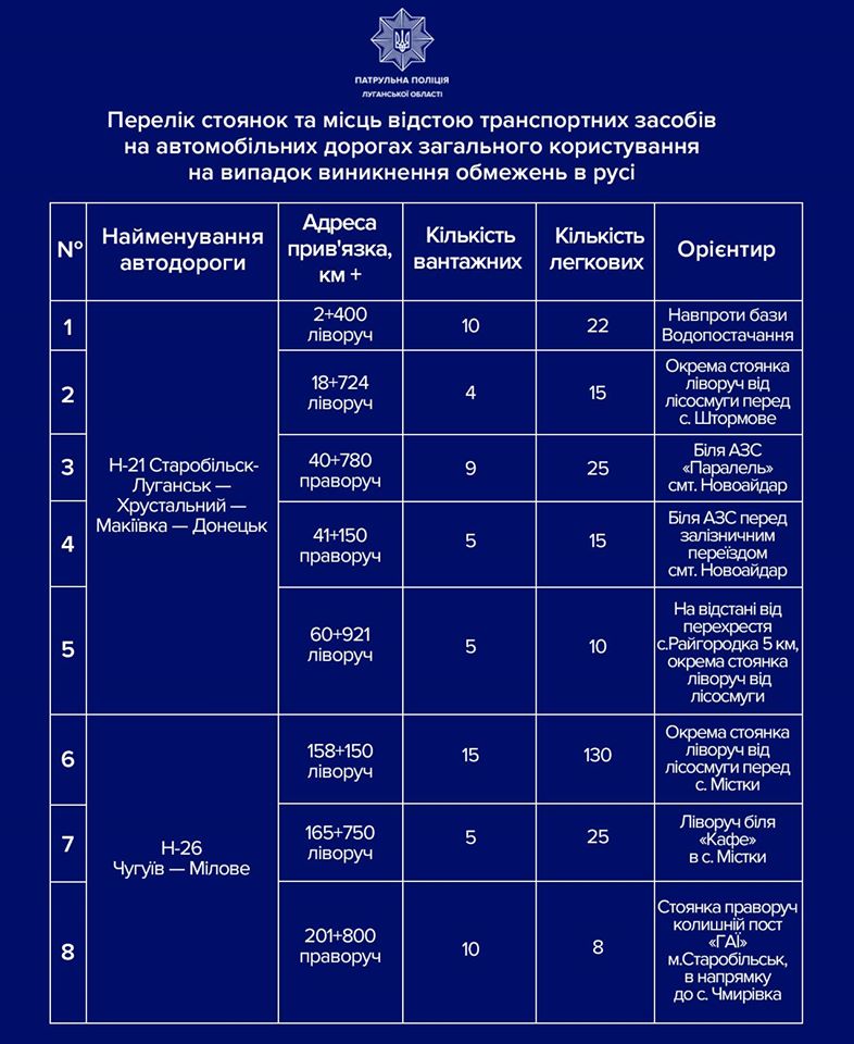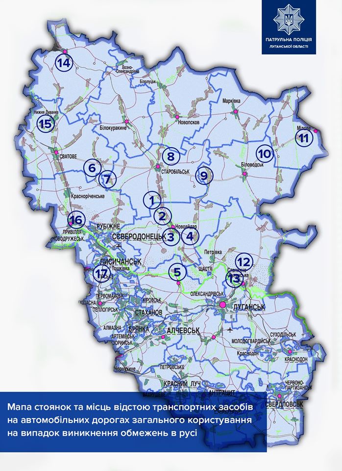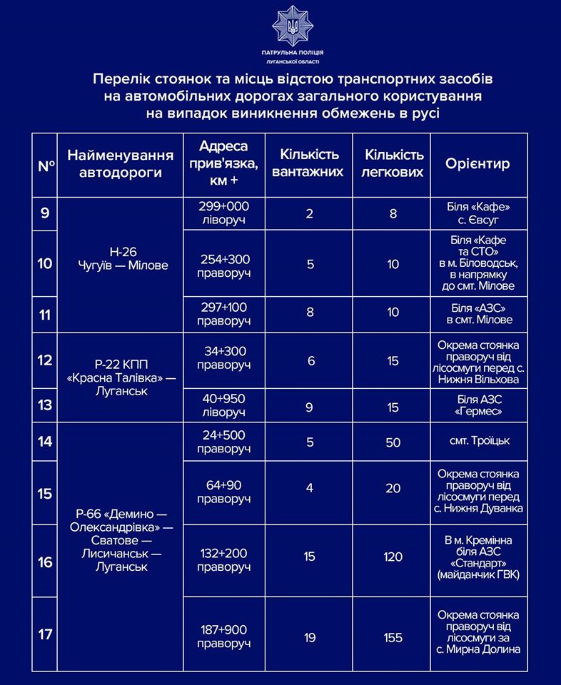 Патрульная полиция Луганской области обнародовала информацию о наличии на автомобильных дорогах общего пользования стоянок и мест отстоя транспортных средств в случае введения ограничений в движении из-за непогоды.