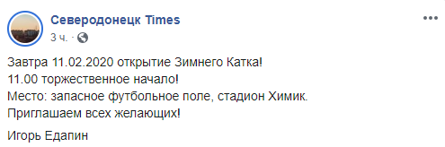Напомним, северодончане почти всю зиму ждали морозов, чтобы наконец заработал каток на запасном футбольном поле ДЮСШ. Его открытие было анонсировано на 10 февраля, но, согласно последней информации, открытие состоится 11 февраля в 11:00.