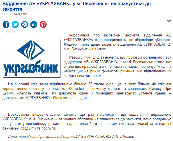 Распространившаяся в сети информация о том, что свою работу в Лисичанске прекратит также "Укргазбанк", не подтверждается. На сайте Лисичанского городского совета опубликовано заявление директора Восточной региональной дирекции АБ «Укргазбанк» А.В. Шмакова о том, что никаких планов относительно закрытия лисичанского отделения нет.