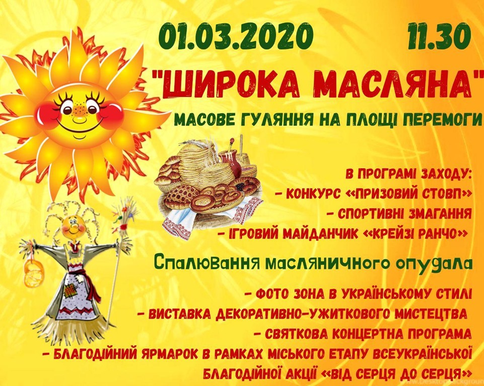 В программе: конкурс "Призовой столб", спортивные соревнования, игровая площадка "Крейзи ранчо", сжигание чучела Масленицы. На площади гостей праздника будут ждать фотозона в украинском стиле, выставка декоративно-прикладного искусства, праздничная концертная программа и благотворительная ярмарка.