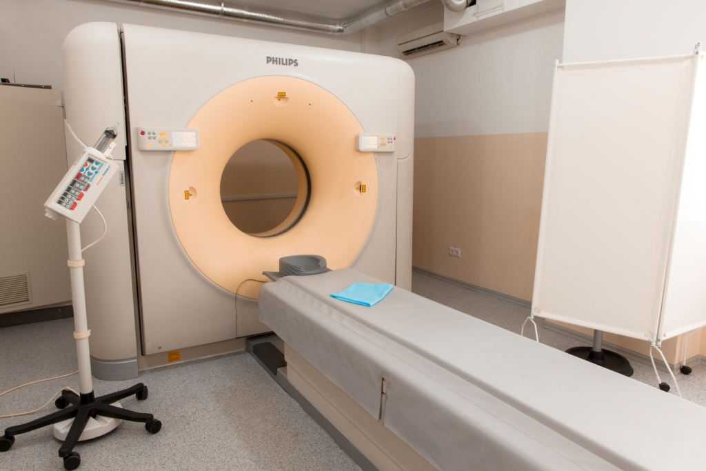 "В Центре установлен современный 64-срезовый спиральный томограф Philips Brilliance. Аппарат позволяет проводить все существующие компьютерные томографические (КТ) исследования, включая сканирование артерий сердца. Большой диаметр гентри ("бублик") и большая грузоподъемность стола позволяет отсканировать пациентов любой комплекции и массы тела (до 200кг). Есть настройки, позволяющие уменьшить дозу облучения без снижения качества изображения.