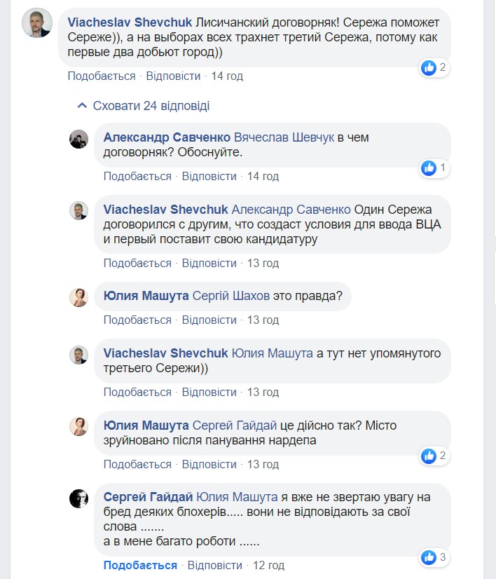 Депутат Лисичанского городского совета Юлия Машута написала на своей странице в Фейсбук об этой перспективе, и получила в ответ неоднозначные комментарии, в том числе от главы Луганской облгосадминистрации Сергея Гайдая.